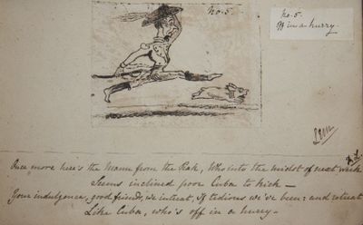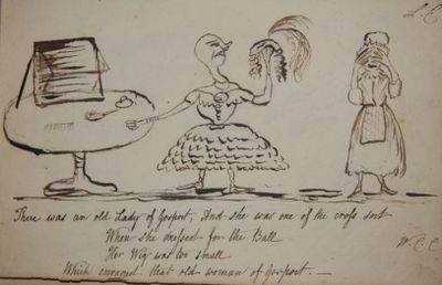 Oblong, 15 by 23 cm. Unpaginated, with 42 pages containing ink illustrations and/or verse, most of which are outlandish and nonsense often in the spirit of Edward Lear.