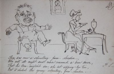 The album had a few contributors, each of whom initialed his contribution. One poem is signed William Colquhoun. Otherwise, the contributions are initialed and their precise identities are unknown. It is probable that a number of the limericks and/or ink illustrations were done by children of the Walter Long, created the First Viscount Long, and their friends. The book carries the bookplate of Long on its FEP, and many of the items are initialed with an L. Long, known as a Irish Unionist, was a leading politician during World War One and the period directly prior and after, serving as First Lord of the Admiralty from 1919 to 1921. The level of artistic proficiency is various, the very best of the artwork has the unforced fluency of a cartoon by a Rococo master, when it is elaborate, or sure-handed and crisp, when a more minimalist sketchy line drawing. And at the lower end, even the most unskilled illustrations do not fail to amuse. (Nowadays, when no longer is artistic self-expression widely cultivated, it is inconceivable that such an album could be created.) The verse has a similar range but also should never fail to bring at least a smile of appreciation. Subject-wise, there is a generous dose of mayhem, cruelty, slapstick, and freakish traits and perverse tics — after all, limericks predominate! There is one narrative set of five limericks about a dog who drank tea; otherwise, the works are all free-standing. There are burlesques of cats, horses, bald ladies, the fat, the skinny — but telling you that this poem is about the “Soldier from Naples” or that one, “the old man on the moon”, really doesn’t relate much about their humor and warpness. Most of the entries are directly into the album, with a handful of illustrations pasted instead.