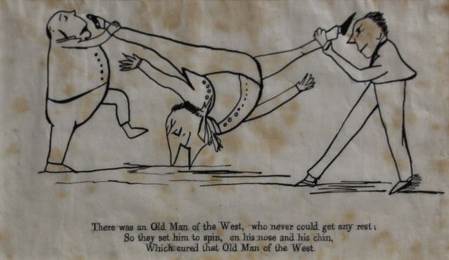 Three original pen & ink drawings by Edward Lear, taken from ‘A Book of Nonsense,’ first published in 1846. The drawings have been examined and fully authenticated as Lear’s work by the late Vivien Noakes, the world expert on Edward Lear. They are drawn on silk, or possibly fine rag paper, and then laid on paper for support. They were drawn, almost certainly for presentation to friends, and would originally have been part of a group of drawings bound in book form, probably at the time of its making in the early 1860’s. There is some staining and browning, but otherwise the drawings are in excellent condition. The drawings are mounted on acid free card and are supplied with a copy of the letter of authentication from Vivien Noakes. Mount sixe: 24.7 x 30.5 cm. Original ‘Nonsense’ drawings by Lear are exceedingly rare.