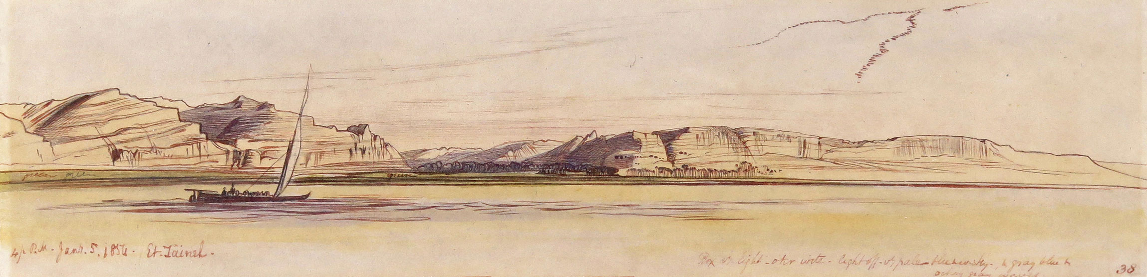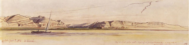 Lear left Cairo after Christmas 1853 with a large party of English, some twelve boats in all. They travelled up the Nile at a leisurely pace, dropping anchor every night. They started their return journey from Philae on February 8th, 1854 (see Edward Lear, Vivian Noakes, London 1985, p.97)