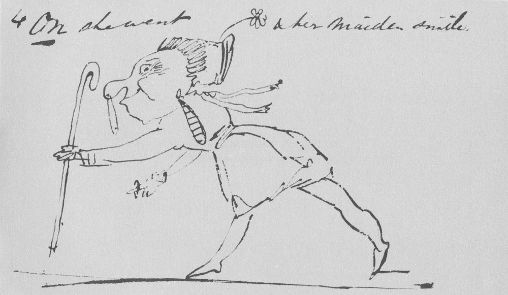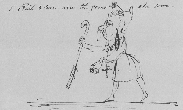 I have already discussed Edward Lear’s Irish sources here, here and here. Another fine instance is the parody in four pictures that Lear drew of Thomas Moore’s “Rich and rare were the gems she wore” from the first volume of Moore’s Irish Melodies (1807):