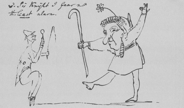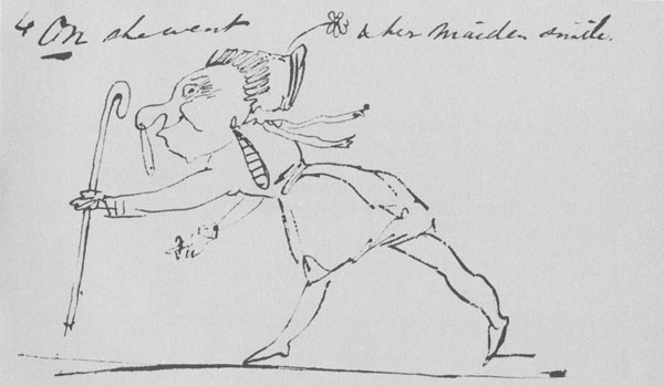 What makes these illustrations (from Lear in the Original pp. 169-173) particularly interesting is that they are clearly no more than an expansion of a caricature by Thomas Hood and show that much of Lear’s early work was inspired by his punning humourous work; here is Hood’s illustration for the poem from his Whims and Oddities, in Prose and Verse (London: Lupton Relfe, 1826), facing page 13: