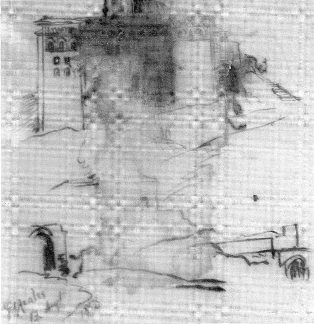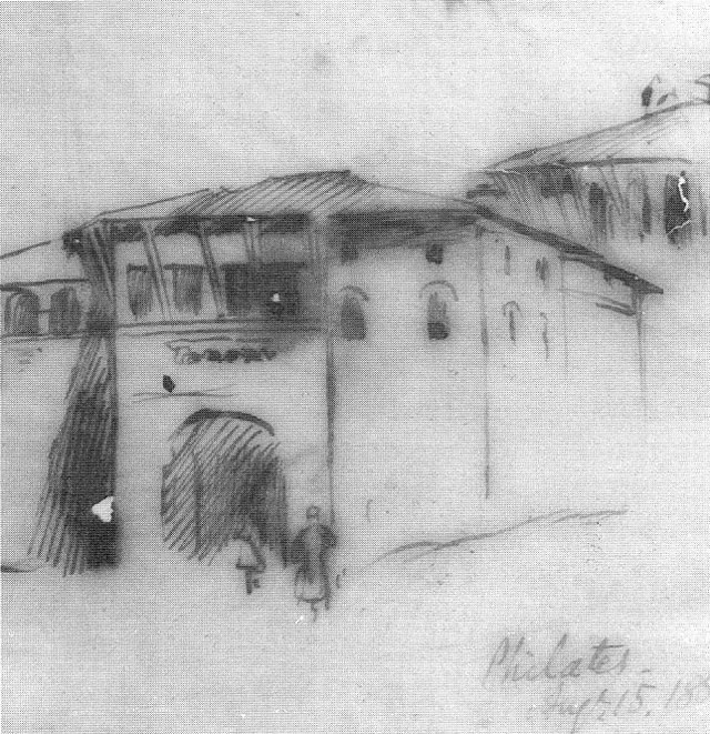 The letter was sent to Mr. Gastaldi, the architect who designed Edwar Lear’s two houses in Sanremo some time after 1880, when the building of the second one, Villa Emily had already been concluded. Lear and Gastaldi had evidently discussed the architecture of Albania and Lear sends the three drawings below, one of which has clearly been damaged by humidity.