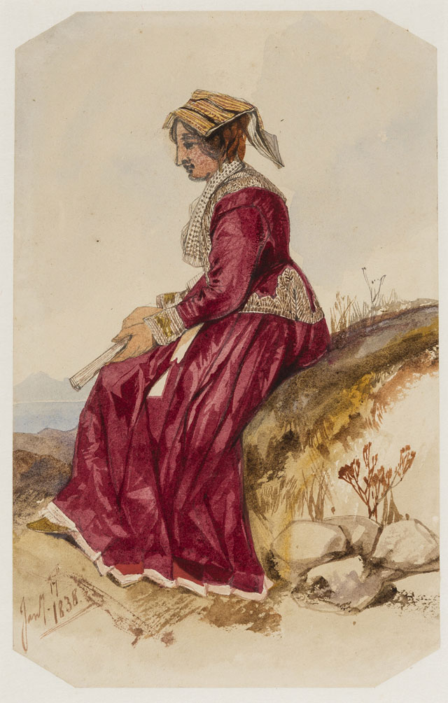 In private correspondence with the present owner, the Houghton Library has suggested that the costume study would have been executed while the artist was working in and around Rome, and that the inscriptions on the verso of each drawing were instructions of how Lear wanted the works mounted with other drawings on large sheets of cardboard, which was how the artist originally intended their presentation.