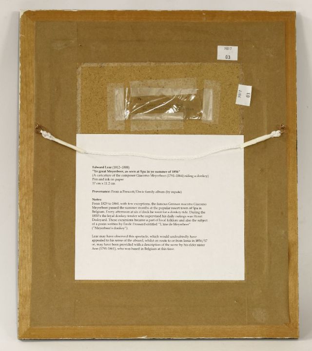From 1829 to 1860, with few exceptions, the famous German maestro Giacomi Meyerbeer passed the summer months at the popular resort town of Spa in Belgium. Every afternoon at six o’clock he went for a donkey ride. During the 1850s the loyal donkey tender who supervised his daily outings was Henri Dedoyard. These excursions became a part of localfolklore and also the subject of a poem written by Émile Frossard entitled “L’âne de Neyerbeer” (“Meyerbeer’s donkey”).Lear may have observed this spectacle, which would undoubtedly have appealed to his sense of the absurd, whilst en route to or from Ionia in 1856/57 or may have been provided wieth a description pf the scene by his elder sister Ann (1791-1861), who was based in Belgium at this time.