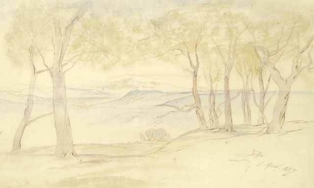 Titled and dated ‘Zitza/7.April.1857’ (lower right); variously and indistinctly annotated elsewehere. Watercolour, pencil and ink. 29.8 x 48.9cm (11 3/4 x 19 1/4in).