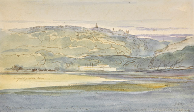 This on-the-spot drawing shows a view on the island of Levkas which, in Lear’s day, was known as Santa Maura. The island lies in the Ionian sea, a region Lear toured in the spring of 1863.