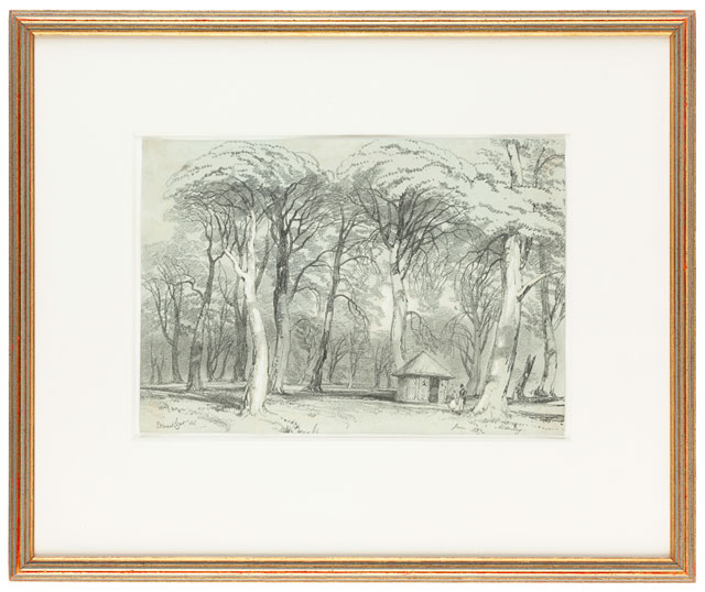 Charcoal with white heightening on gray paper under Plexiglas. Signed lower left: Edward Lear, dated and titled lower right: June, 1837 . Sheet: 9.75″ H x 14″ W. Condition: Generally good condition. Framed floating and mounted to the back mat. Not examined out of the frame. Frame: 19″ H x 22.75″ W x 1″ D.
