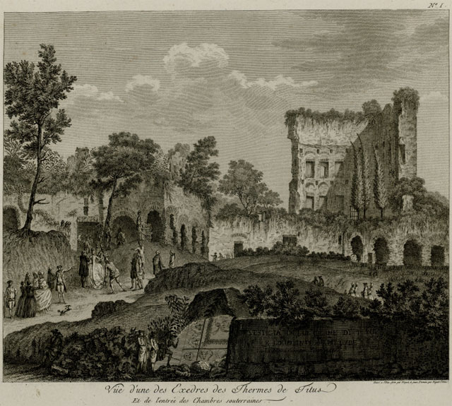 One of the features of the baths was mural designs by the artist Famulus (or Fabullus), both al fresco and al stucco. Before the designs fell into disrepair from exposure to the elements, Nicholas Ponce copied and reproduced them as engravings in his volume “Description des bains de Titus” (Paris, 1786). The designs are now recognized as a source of the style known as “grotesque” (meaning “like a small cave, a hollow, a grotto”) because the ruins of the Baths of Titus were in a hollow in the ground when they were discovered