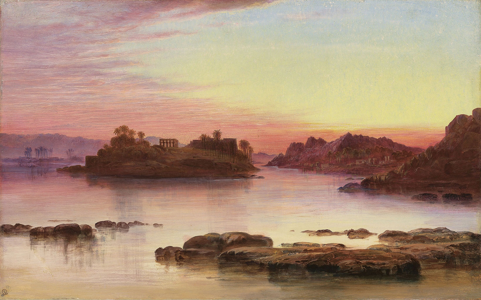 Lear visited Philae, on the Nile near Aswan, in late January and early February 1854 and again in January 1867. On his frst journey he was captivated by the complex of temples on the island and spent ten days camping in the Temple of Isis. He wrote to his sister Ann on 7 February 1854: ‘It is impossible to describe the place to you any further than by saying it is more like a real fairy-island than anything else I can compare it to. It is very small, & was well covered with temples, of which the ruins of 5 or 6 now only remain. The great T. of Isis, on the terrace of which I am now writing, is so extremely wonderful that no words can give the least idea of it. The Nile is divided here into several channels, but other rocky islands, & beyond you see the desert & the great granite hills of Assouan.’ On both his visits to Egypt Lear felt frustrated by his inability to capture the clarity of light and brilliance of colour of Egypt in his work, particularly as oil dried so fast in the local atmosphere that he was limited to just watercolour. However, he later worked up a number of oils from his sketches including the present example.
