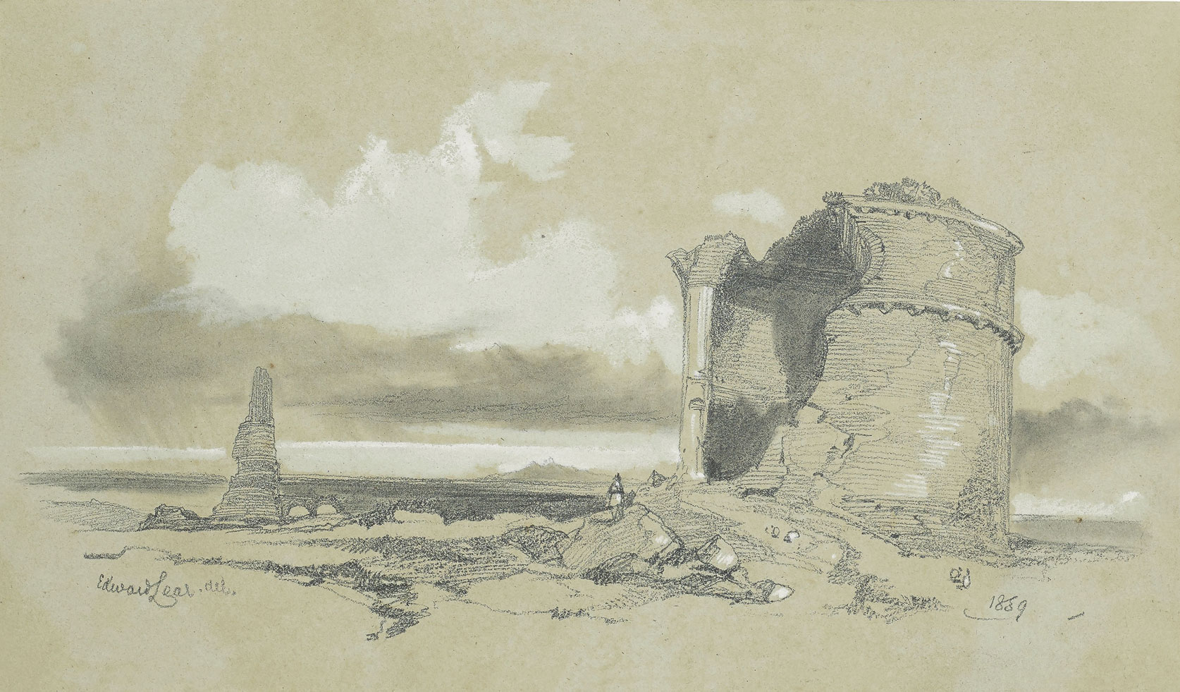 Signed ‘Edward Lear. del.’ (lower left) and dated ‘1839’ (lower right). Graphite heightened with touches of white, on buff paper. 5 ½ x 9 ¼ in. (13.8 x 23.3 cm).