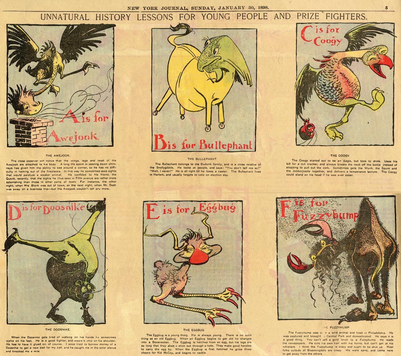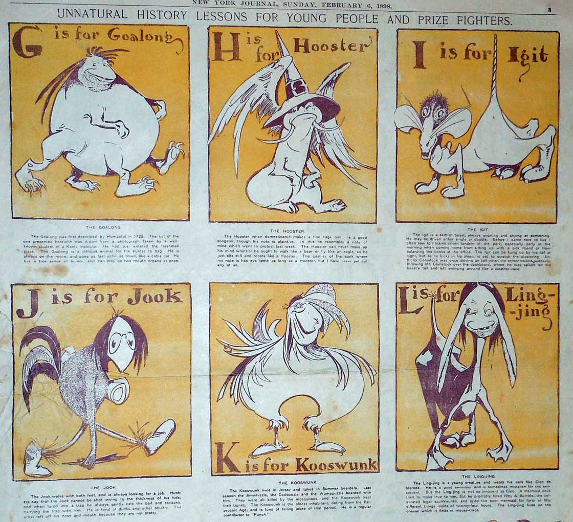 Almost six years ago I posted the central part of an invented-animal alphabet published in the New York Journal in 1908. Allan Holtz of Stripper’s Guide (read his post, in which he identifies the author, Bob Addams, and links to more strange natural history by the same) has now unearthed the first part:
