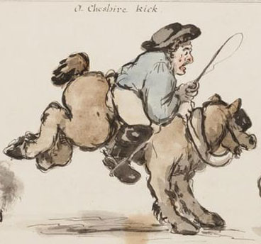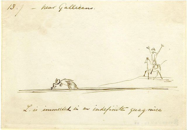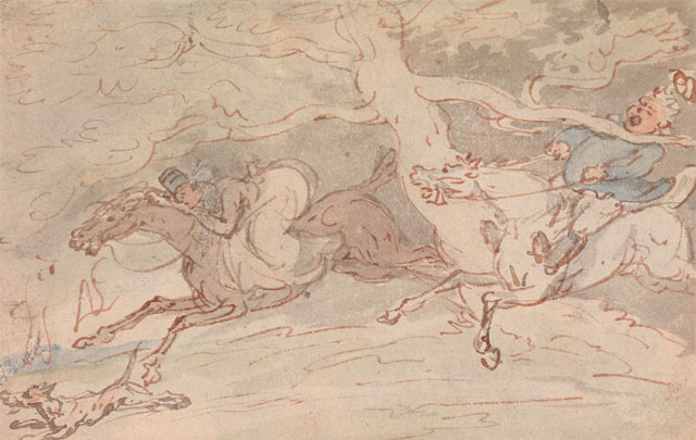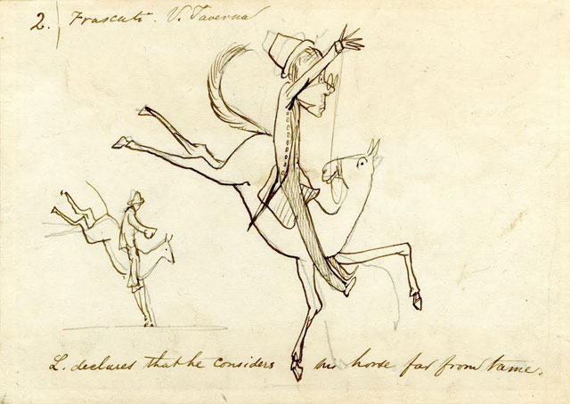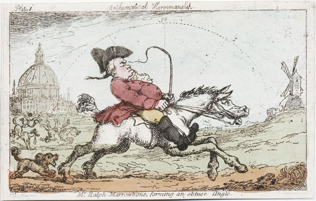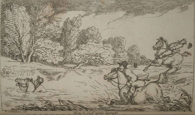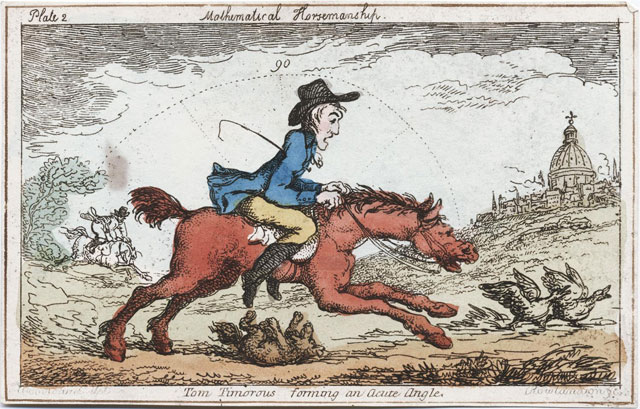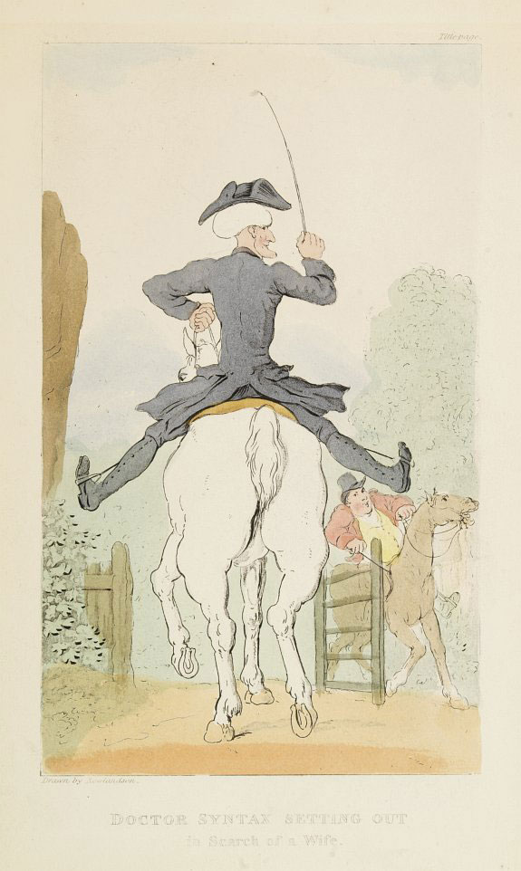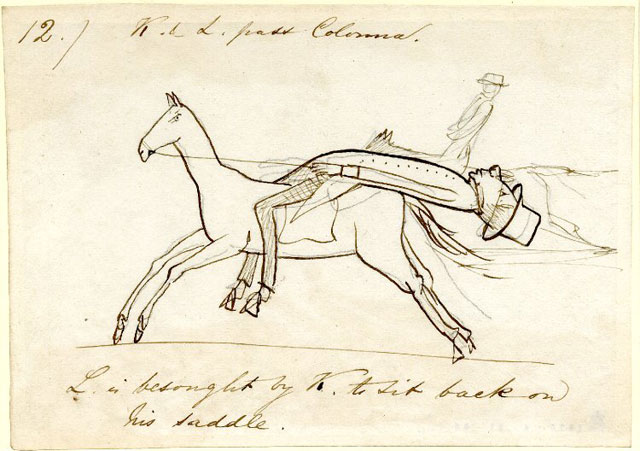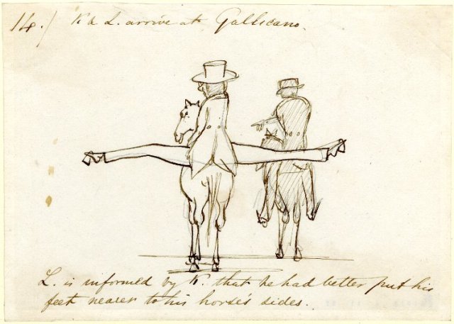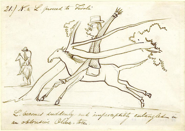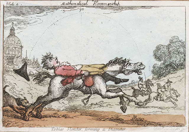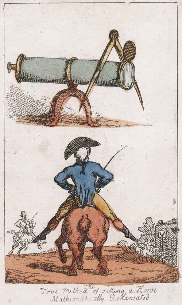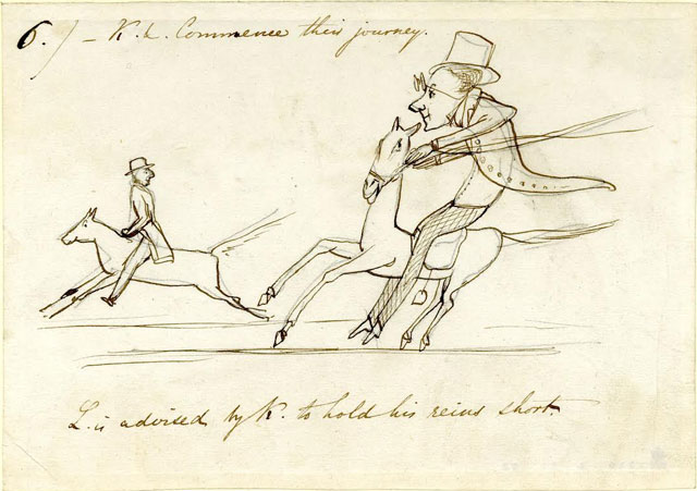 The examples below show how, even when telling an original, personal story, Lear could not avoid being strongly influenced by the long tradition of English caricature, and most of all by Thomas Rowlandson’s many series of prints devoted to horse riding, while at the same time using such well-known images to tell an original story.