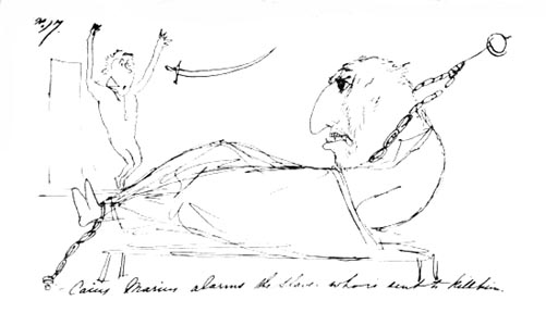 While discussing “The Tragical Life and Death of Caius Marius,” probably in large part based on Plutarch, Makins, p. 222 note 12, notices that pictures 15 to 18 appear to be based on Oliver Goldsmith’s The Roman History, from the Foundation of the City of Rome to the Destruction of the Western Empire. Abridged for the Use of Schools, London: J. Williams, 1781, pp. 117-118. A book Lear had perhaps read as a young boy, or was reading with the child of a friend. After checking the text here is what I think she found corresponding to Goldsmith’s version: