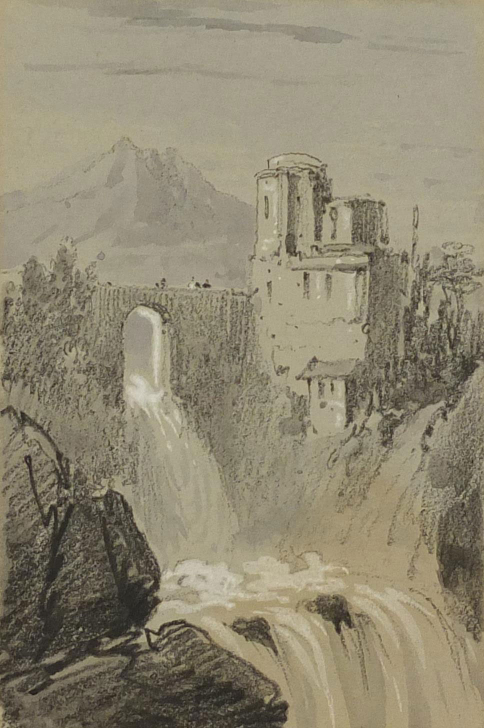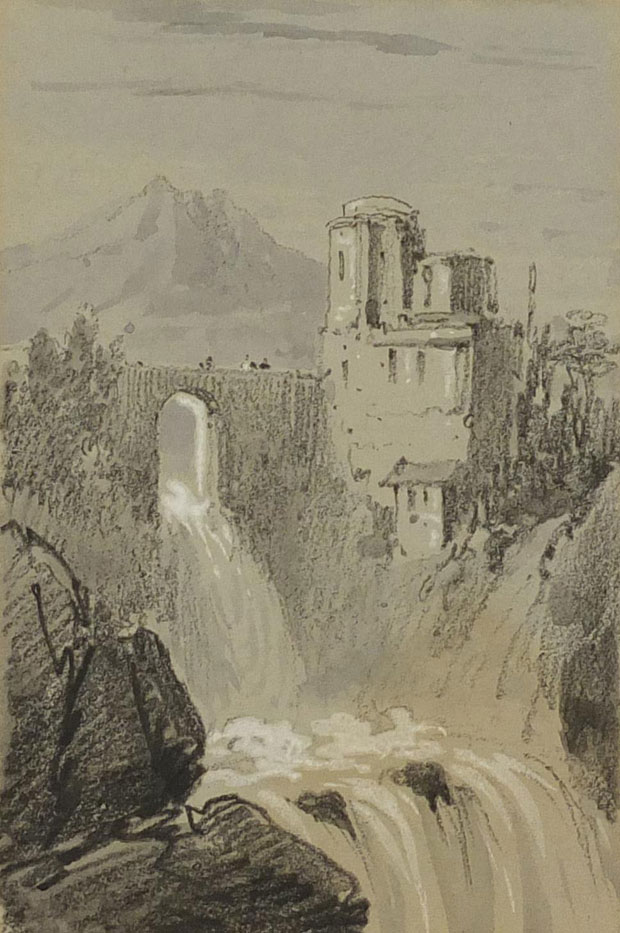 Edward Lear, Castle by a waterfall with a mountain beyond.