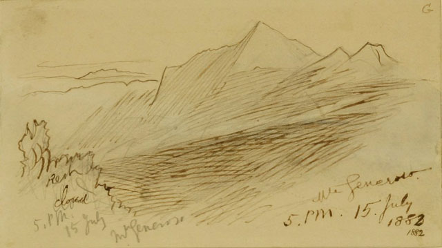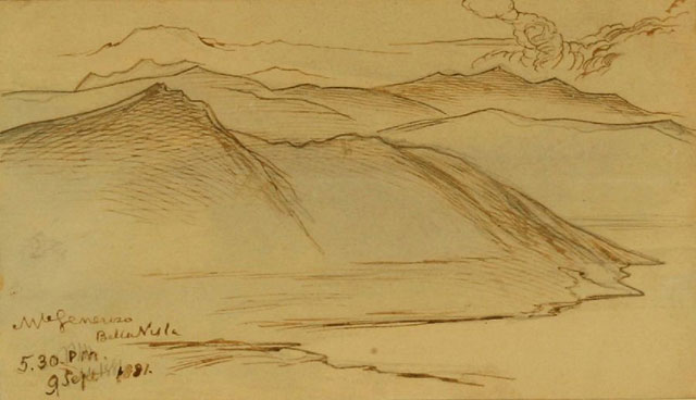 Inscribed and dated in ink l.r.: M.Generoso/5 pm/15 July 1882and similarly in pencil (l.l.) Pen and sepia ink over traces of pencil, 10 by 17 cm.