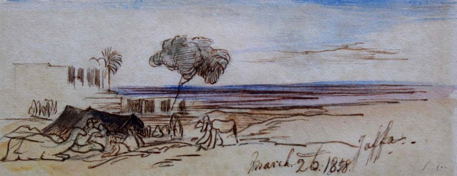 Inscribed l.r.: Jaffa and dated March 26 1858. Watercolour over pen and ink and pencil, 4.5 by 12.5 cm.