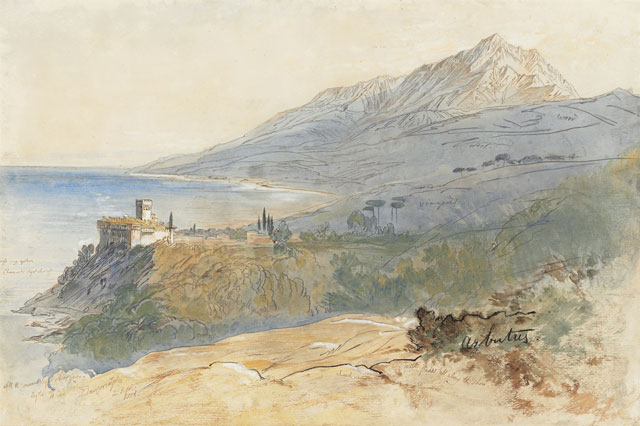 This drawing is a study for Lear’s most famous Mount Athos painting, Mount Athos and the Monastery of Stavronikétes, now at the Yale Center for British Art, New Haven.
