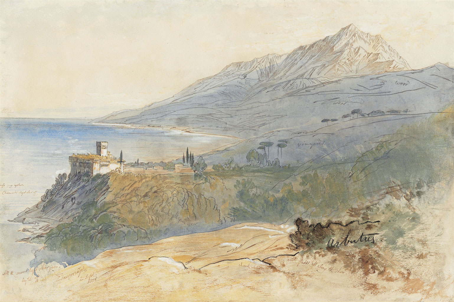 Lear attempted to visit Mount Athos in 1848 with Church, but was unsuccessful. He eventually returned in September 1856, visiting all twenty principal monasteries and many of their dependencies. He produced a series of fifty drawings of the monasteries and landscapes, of which the present drawing is part. He apparently intended to publish a volume of his tour of Mount Athos but this was never fulfilled, although he did adapt several of his drawings for his series of illustrations to Tennyson’s poems.
