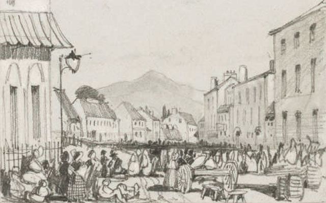 The view up Bray Main street is taken from the north end of the town. The old Market House was demolished shortly after Lear visited in 1835, replaced by a building looking very similar to that depicted here, now functioning as Bray Heritage Centre. Lear faced south with the bridge over the River Dargle behind him. The view of the little Sugar Loaf looks much the same, and several of the buildings seen in this picture remain, 185 years later. The traffic situation, however, has changed markedly.