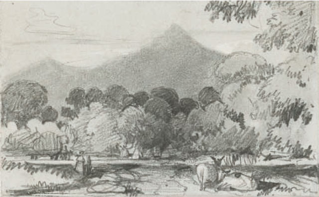 Edward Lear, Five views in County Wicklow: The Great and Little Sugarloafs; The Great and Little Sugarloafs, from The Scalp; Figures beside trees, probably in the Powerscourt Demesne; Loch Tay looking north; and Bray, with the Little Sugarloaf in the distance.