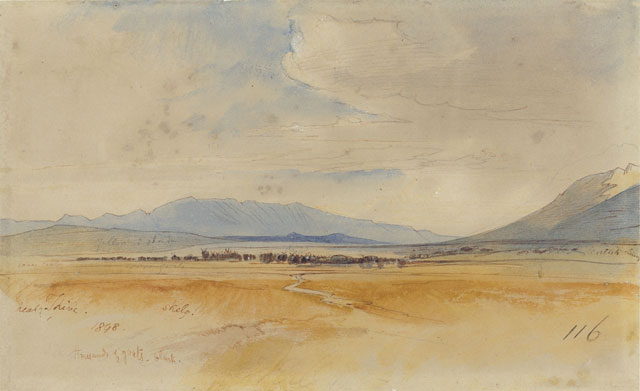 Inscribed and dated ‘near Thiva. / 1848./ thousands of goats black’ (lower left), numbered ‘116’ (lower right), and inscribed with colour notes throughout. Pencil, pen and brown ink and watercolour. 6 ¼ x 10 ¼ in. (15.9 x 26 cm.)