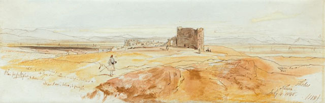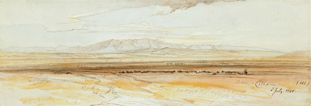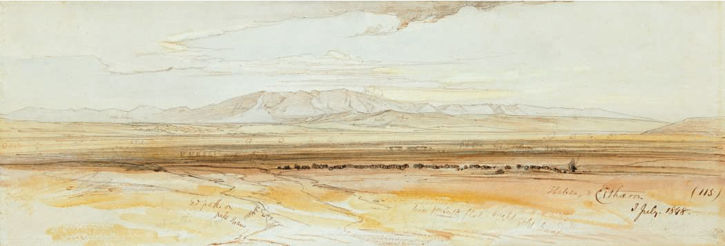 The frst inscribed and dated ‘Thebes & Cithaeron / 3. July. 1848 / (115)’ (lower right), and inscribed with artist’s notes throughout; the second inscribed and dated ‘Thebes / Thiva. / July 4. 1848. (118)’ (lower right), and inscribed with artist’s notes throughout. Pencil, pen and brown ink and watercolour. 6⅞ x 20 in. (17.5 x 50.8 cm.); 6⅝ x 20 in. (16.8 x 50.8 cm.)