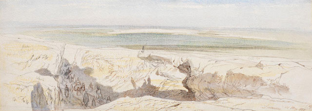 Having visited Jerusalem in the Spring of 1858, Lear set off for the Lebanon, travelling by boat from Jaffa, arriving in Beirut on the 11th May, and moving inland. Lear found the landscape too similar to Greece and Albania, although his opinion of Damascus was more positive, writing to Lady Waldegrave ‘imagine 16 worlds full of gardens rolled out flat, with a river and a glittering city in the middle’.1