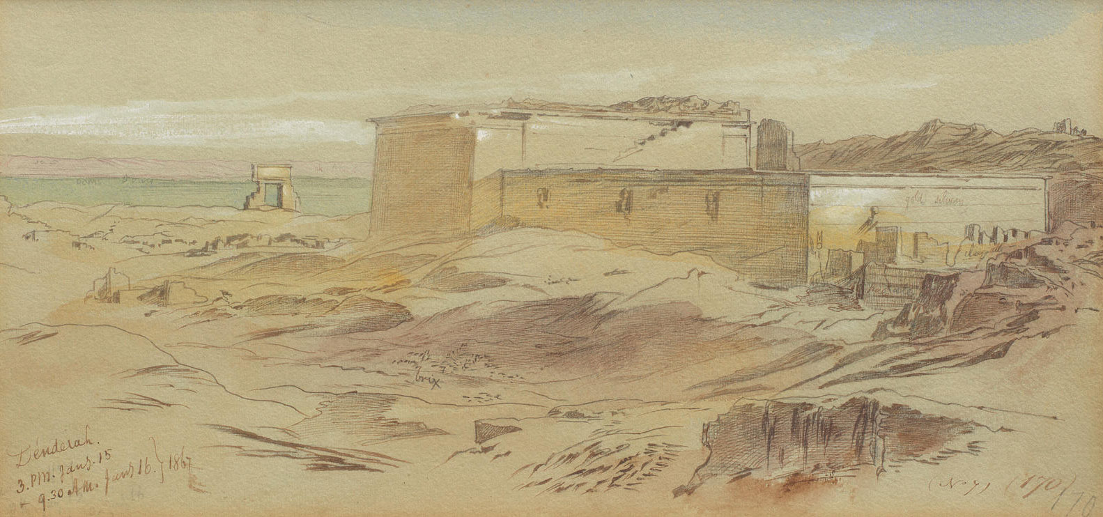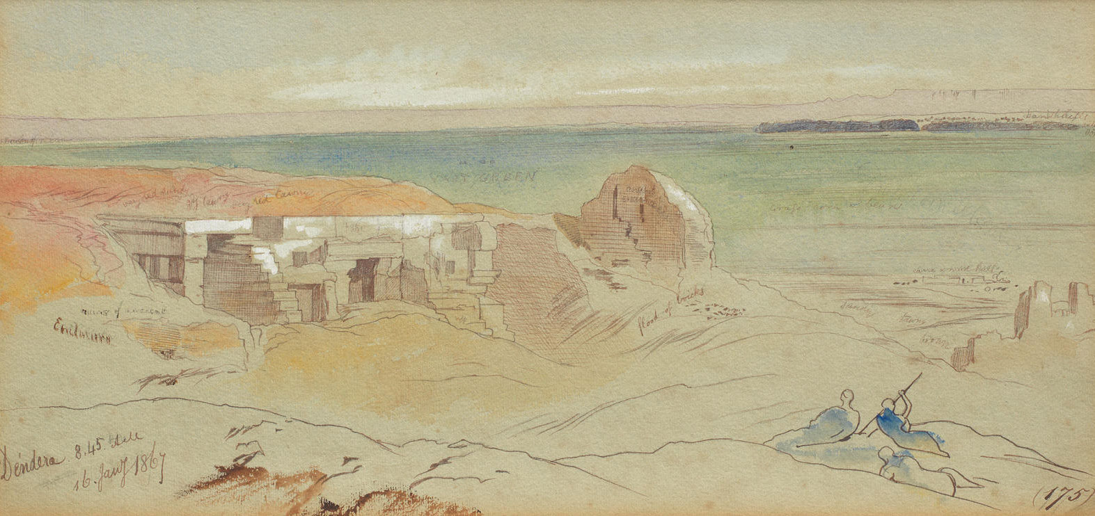 A pair, one inscribed and dated ‘Denderah/3.PM.Jany.15/9.30.AM.Jany16.}1867’ (lower left); numbered ‘(No 7) (170)’ (lower right) and the other inscribed and dated ‘Dendera 8.45 AM/16.Jany 1867′ (lower left)’ numbered ‘(175)’ (lower right); both also annotated throughout. Pen, ink and watercolour heightened with bodycolour. each 16.2 x 34.4cm (6 3/8 x 13 9/16in).