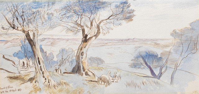 Inscribed and dated ‘Mount of Olives./4.30. PM. 10 April 1867.’ (lower left); numbered ‘(31)’ (lower right); annotated throughout. Pen, ink and watercolour over traces of pencil. 24 x 50cm (9 7/16 x 19 11/16in).