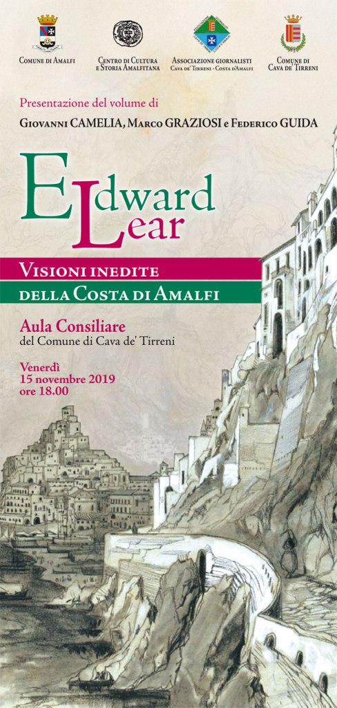 Next Friday, November 15, I will be in Cava de’ Tirreni for a presentation of Edward Lear: Visioni inedite della costa di Amalfi; if you are in the area, please come meet me and the other authors. Download the full brochure.