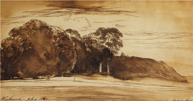 Signed Edward Lear del. lower right; inscribed and dated Hackwood. July 9 1865 lower left. Pen and brown ink. 18.7 by 36.4cm. 7 by 15½in. Framed: 21.5 by 39cm., 8¾ by 15½in.