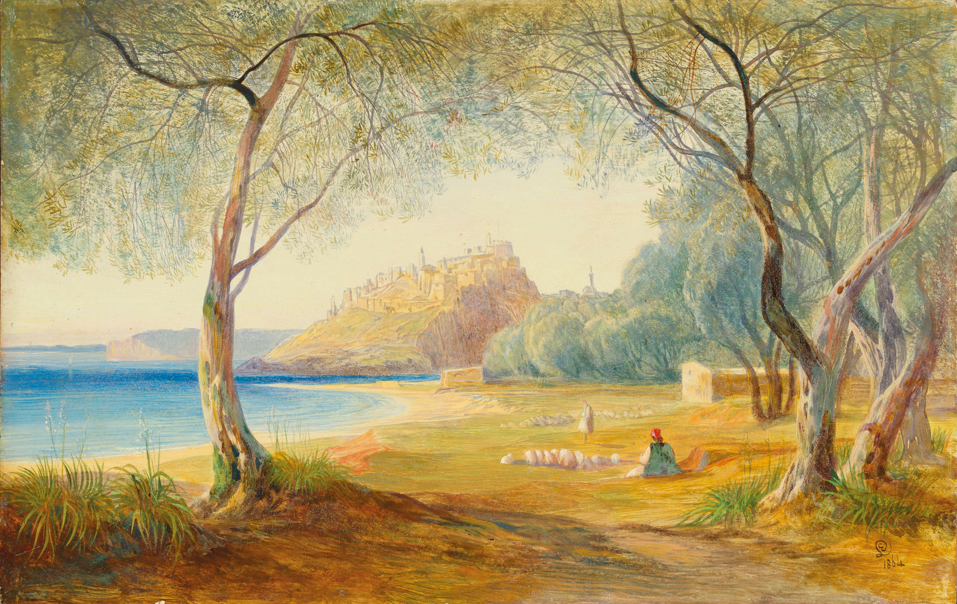 Lear travelled through Albania and Macedonia in 1848 and his journals of that time give an insight into the country and its customs during the 19th century. They detail some of the challenges and romance of travelling through a country previously unseen by many foreigners. He was particularly struck by the beauty of Monastir (Bitola): ‘the bustle and brilliancy….is remarkable…a river runs through the town…. either look up or down the river, the intermixture of minarets and mosques, with cypress and willow foliage, forms subjects of the most admirable beauty.’ (B. Destani (ed.), Edward Lear in Albania: Journals of a Landscape Painter in the Balkans, London, 2008, p. 21). Parga ‘from every point… lovely’ was observed to be ‘very unlike Albanian landscape in general’ (op.cit., p. 184) but rather closer to Calabria and Amalfi. Both the present paintings were worked up from sketches several years later, as Lear found working outdoors in Albania presented one unforseen challenge: many locals thought his activities the work of the devil and he was often driven away from his chosen vantage point.
