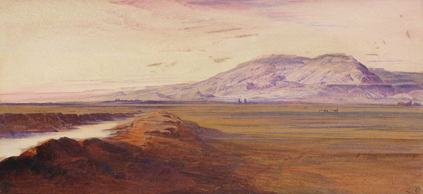 Lear visited Thebes in February 1854, spending ten days sketching the temples, ruins and landscape, as part of his journey along the Nile. A similar composition to the present lot, painted in 1885 and based on sketches made during this visit, is in the collection of the RISD Museum, Rhode Island.