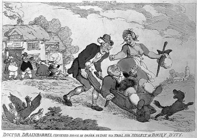 Doctor Drainbarrel is placed in a wheelbarrow and carted home. Coloured etching by T. Rowlandson after himself, c. 1800: