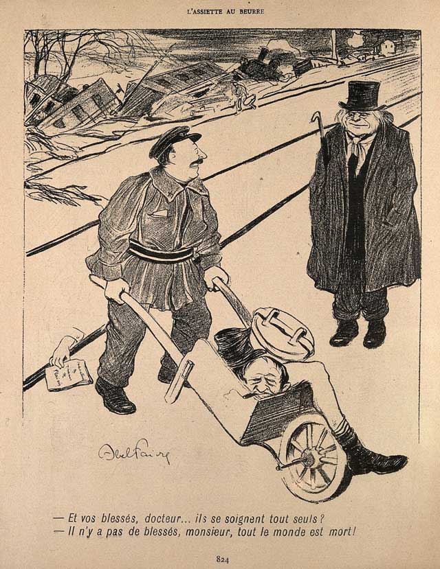 A railway employee (?) wheels away the dismembered body of a man killed in a railway accident; he converses with a physician: