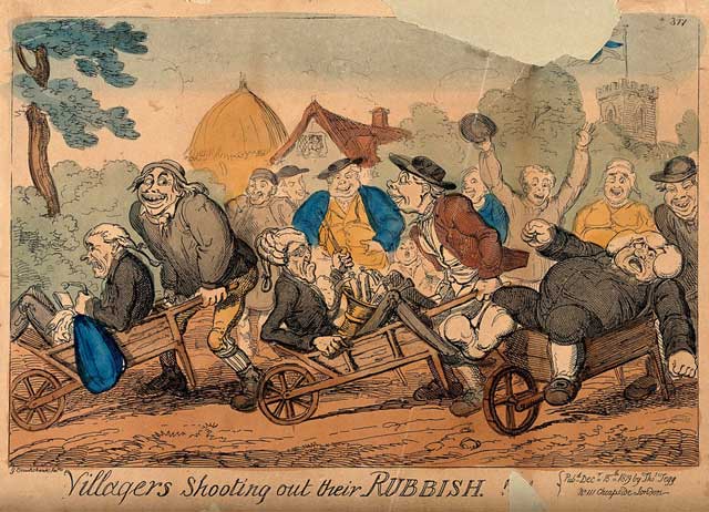 Country folk pushing a lawyer, a physician and a gouty vicar in wheelbarrows out of their village. Coloured etching by G. Cruikshank, 1819: