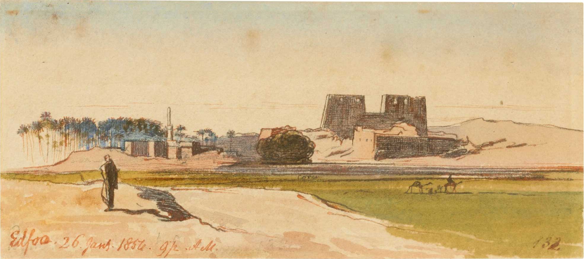 Pen and brown ink and watercolour over traces of pencil; inscribed lower left: Edfoo.26. Janr.1854 .9 ½ .A.M. 132, and further inscribed with the artist’s colour notes. 68 by 152 mm.