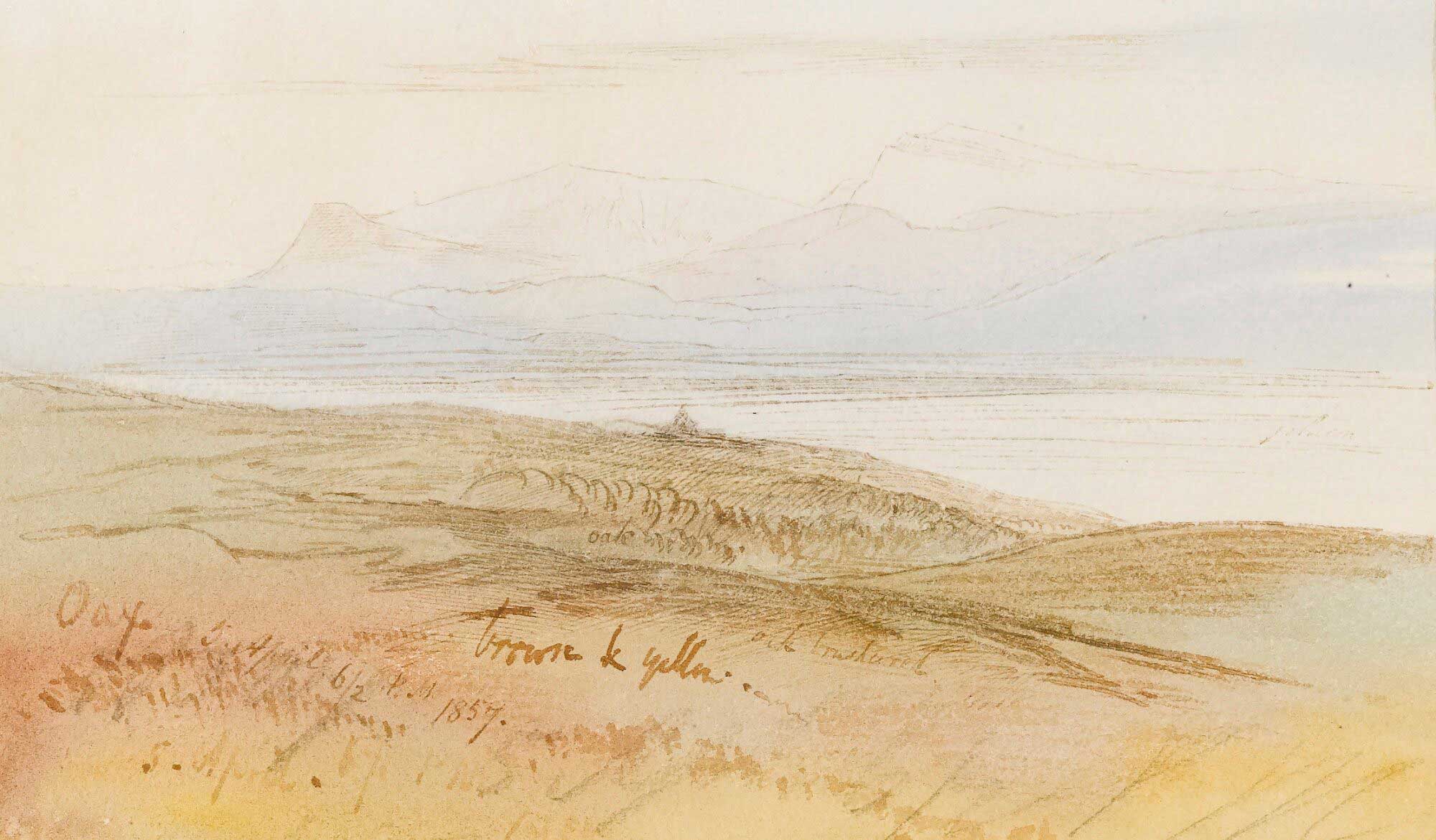 Pen and brown ink and watercolour over pencil on paper. Inscribed with the artist’s colour notes and dated: 5 April 6/7pm 1857. 14 by 23cm., 5 by 8½ in. Executed in 1857.
