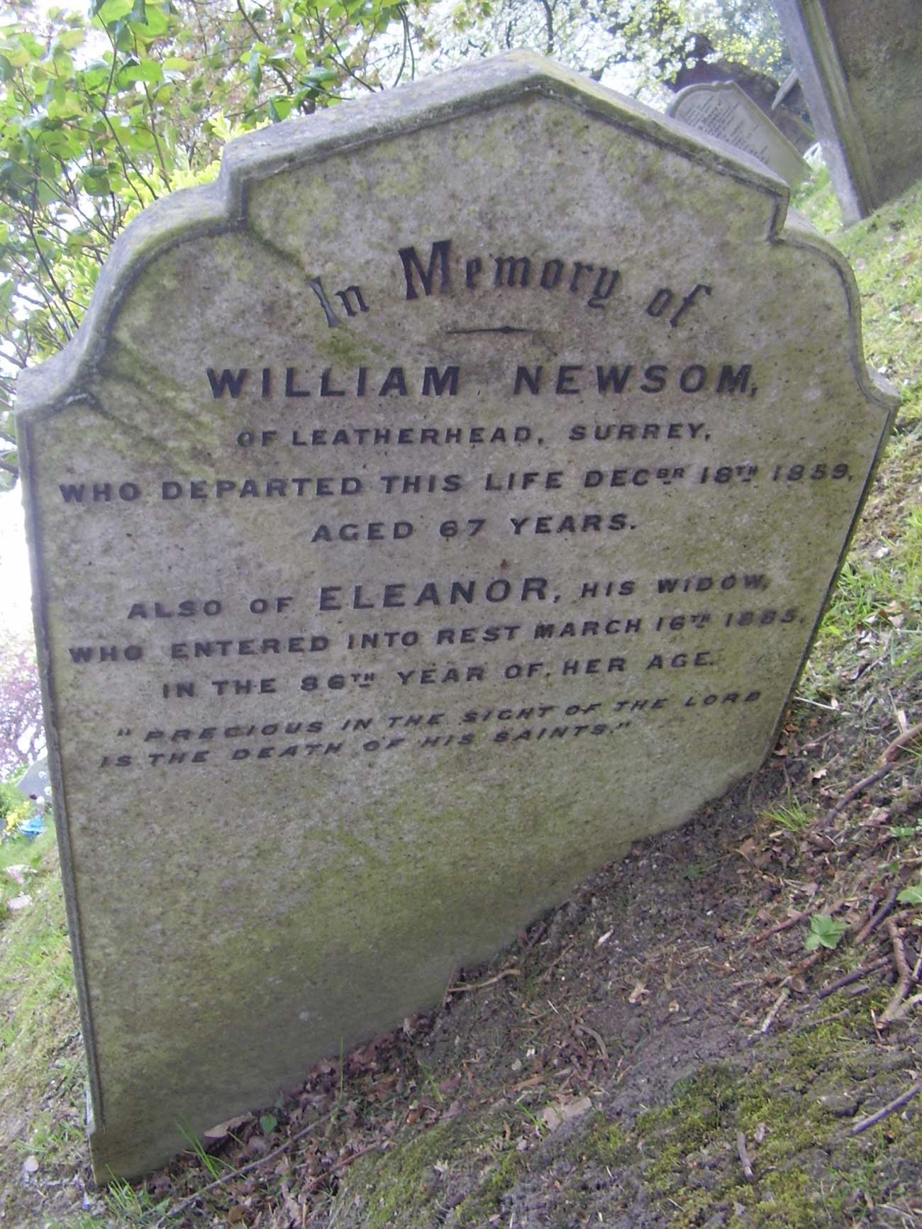Jo also sent me a link to photos of the grave of William Newsom and his wife Eleanor, née Lear, in West Norwood Cemetery and Crematorium, West Norwood, London Borough of Lambeth, Greater London:
