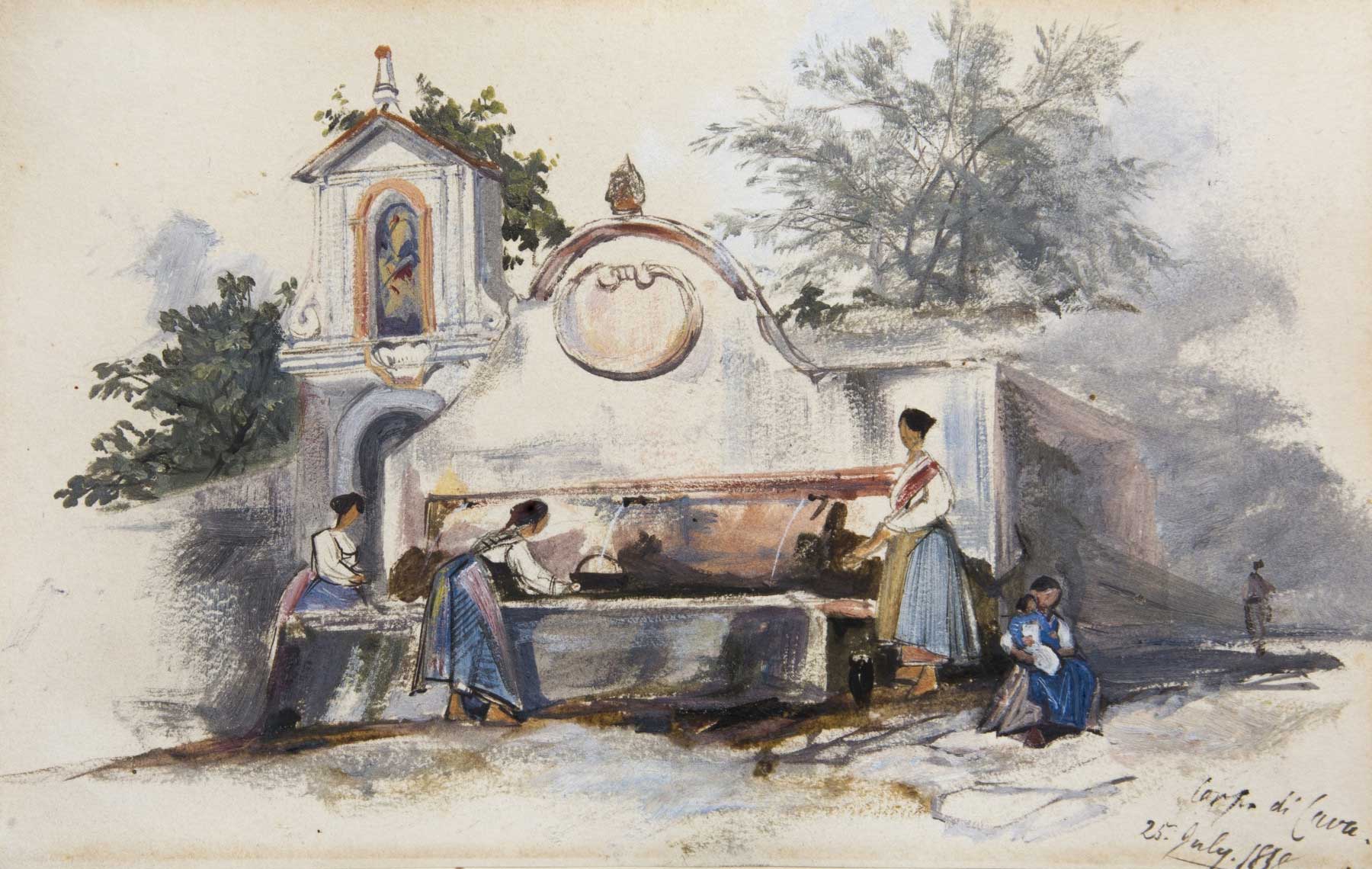Late in June, Lear and Uwins moved from Corpo di Cava to Amalfi, on the coast west of Salerno, and stayed for three weeks at the Albergo Cappucini, until 18 July. The visitors’ book reveals that they overlapped with Achille Vianelli and Ercole Gigante, two landscape painters of the School of Posillipo. It was following their return to Corpo di Cava in late July that Lear produced Collecting Water, Corpo di Cava. This shows Lear experimenting with oil – on paper – for the first time, sometimes purely and sometimes in conjunction with other, water-based media. His decade in Italy is defined in part by his decision to take seriously to oils. He and Uwins finally left Corpo di Cava at the beginning of August, in order to stay in Sorrento, on the southern extreme of the Bay of Naples. At the end of the month, they began their slow return to Rome.