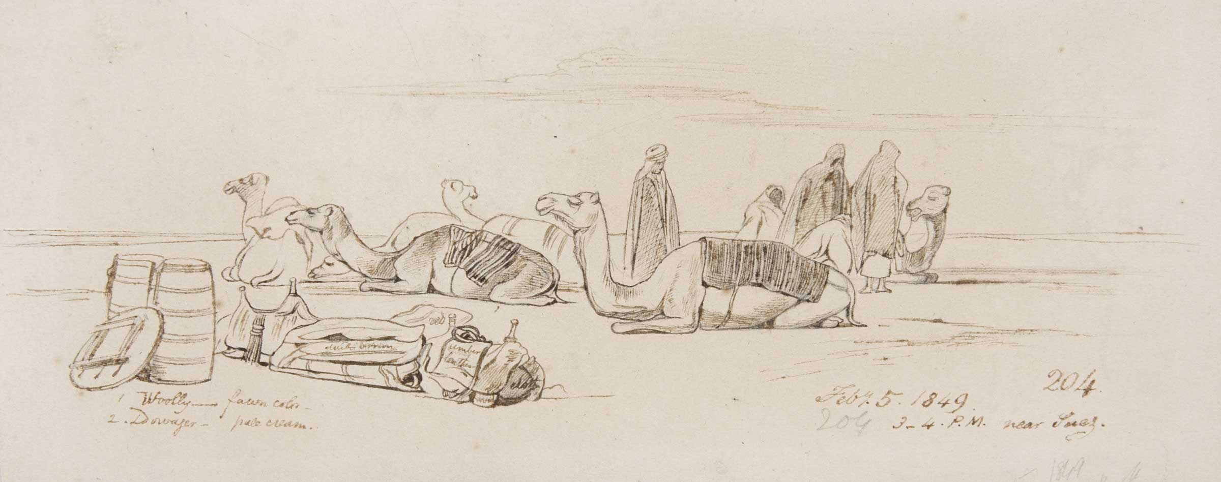 The present drawing was made outside Suez on 5 February 1849, near the end of the trip. It is likely to be at least one of five studies of camels produced on that day. Two others are in the collection of the Houghton Library, Harvard University. The first, numbered ‘200’ and drawn at 10 am, focusses on a single camel which has been tethered by its front leg. The second, numbered ‘201’ and drawn at noon, comprises studies of six dead camels in various states of decomposition, one of which is being picked over by vultures. As