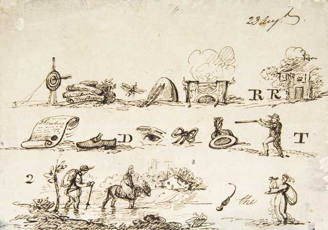 A rebus is a text that is presented as a combination of images and individual letters. The form may have originated in Egypt as early as 3400 BC, but was certainly popular in England during the eighteenth and nineteenth centuries, both in correspondence and as an entertainment. The present example by Edward Lear may be either the beginning of a letter or an element in a game. It spells out the following message: ‘I would be a great arse in/writing should I not attempt/to afford to catch the muse’. The use of the word ‘arse’ may seem out of character for such a writer as Lear. However, it does appear in his diaries, including the entry for 1 September 1867, when he relays the words of a German tutor spoken during a game of Charades: ‘it is Arse: for it says – let it be concealed – certainly I should always conceal my arse: nobody should show his arse’.