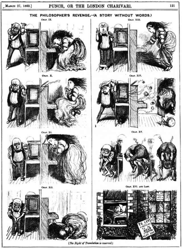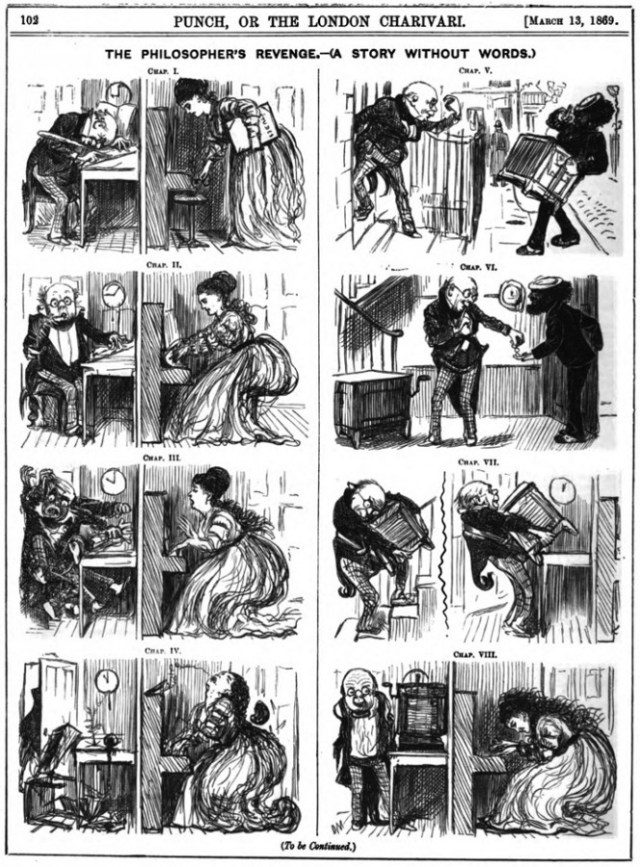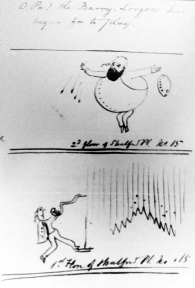 The cartoon is remarkably similar to a George du Maurier strip from Punch, 13 March 1869, but by the time it was published Lear had already left the rooms at 15, Stratford Pl. (Diary, 15 September 1868) and from that moment, when in London he stayed at 8 or 10 Duchess St.