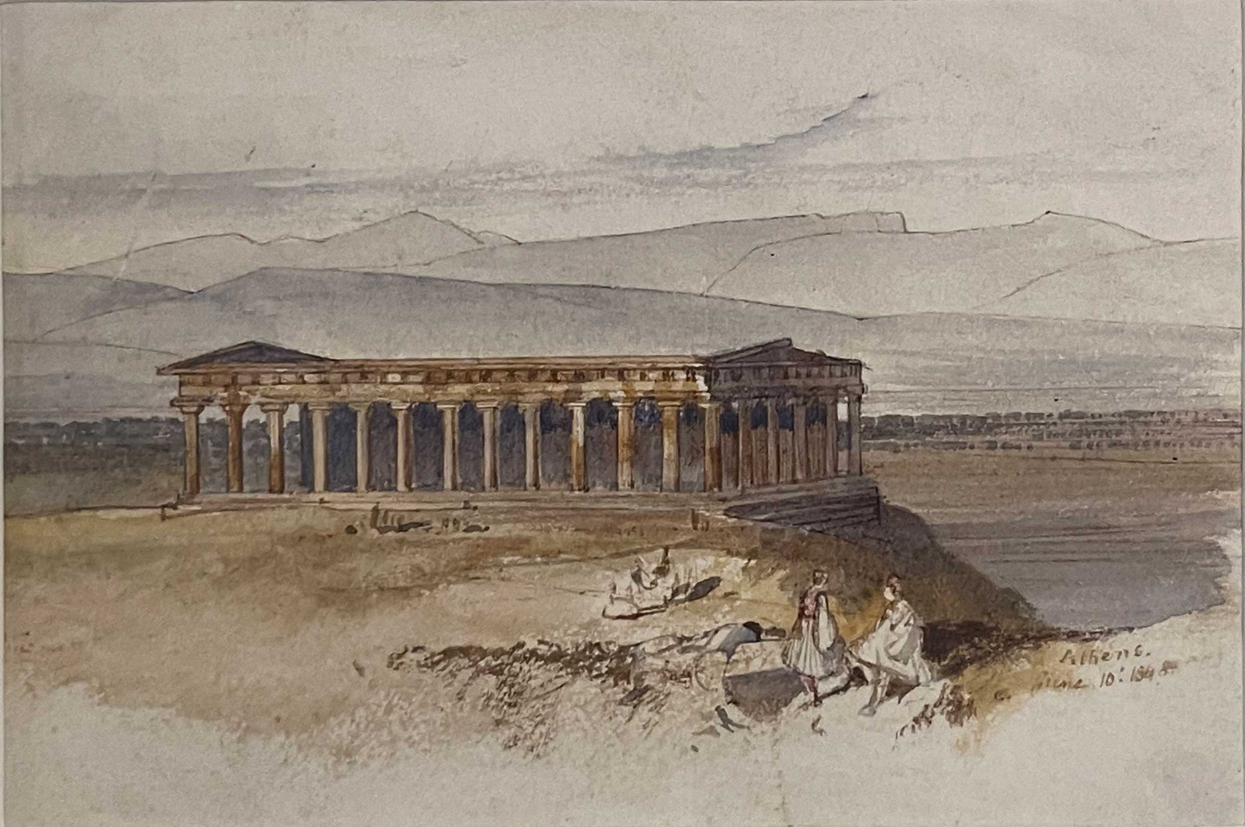 With seated figures in the foreground. On paper. Signed and dated. Inscribed: “Athens / June 10th 1848”. (reverse) Thomas Agnew & Sons label: “no 36717”; “no 75 E. Lear Athens”. 3.75 in x 5.75 in.
