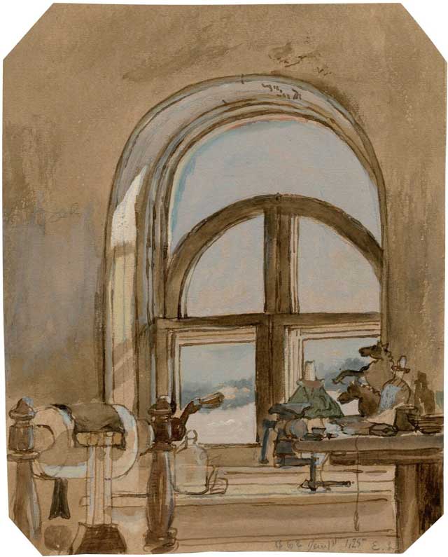 I think you may be right, Annalise Falzon. If not a trouser press, the handle certainly operates the drum on which the clothing is lying. This suggests that the room depicted is not a bathroom, as I thought previously, but an attic bedroom, its fireplace and mantlepiece on the right side, with bottles holding candle stubs, one of which is reflected in the mirror. The winter view with weak sunshine lies below and beyond the window. Lear sometimes resented the relatively poor accommodation he was offered by his hosts.