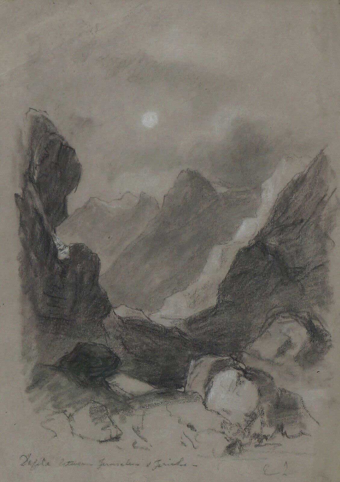 Charcoal on paper, c.1837/1838. Inscribed l.l. ‘Defile between Jerusalem & Jericho’ and l.r. ‘EL’, 25.6 x 18.3 cm.