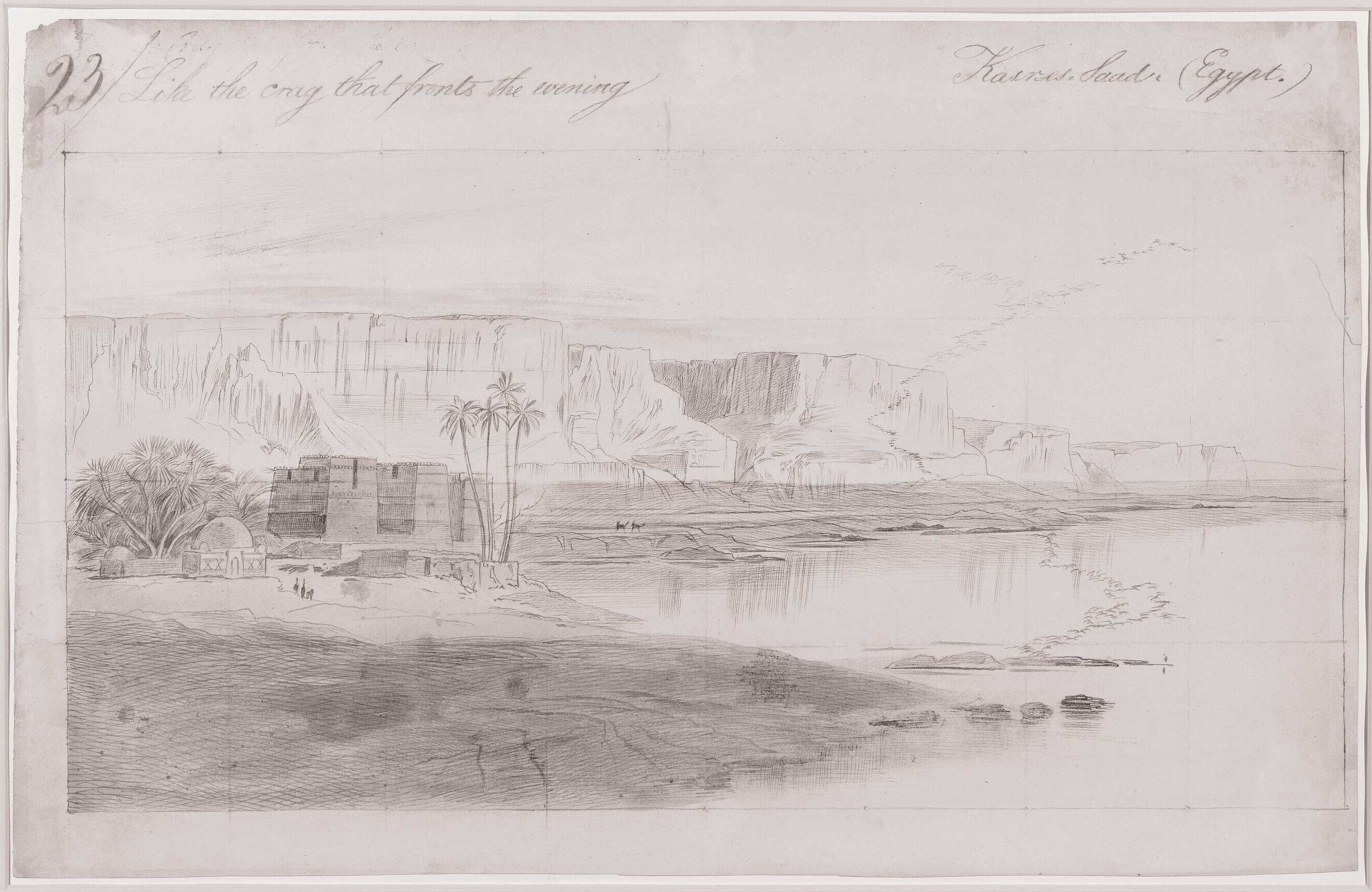 Inscribed and numbered ’23/ Like the crag that fronts the evening’ (upper left) and further inscribed ‘Kasres.Saad. (Egypt.)’ (upper right). Pencil, pen and brown ink, brown and grey wash, lightly squared on paper watermarked ‘JWHATMAN/ 18[?]2’. 13 5⁄8 x 21 1⁄4 in. (34.6 x 54 cm.)