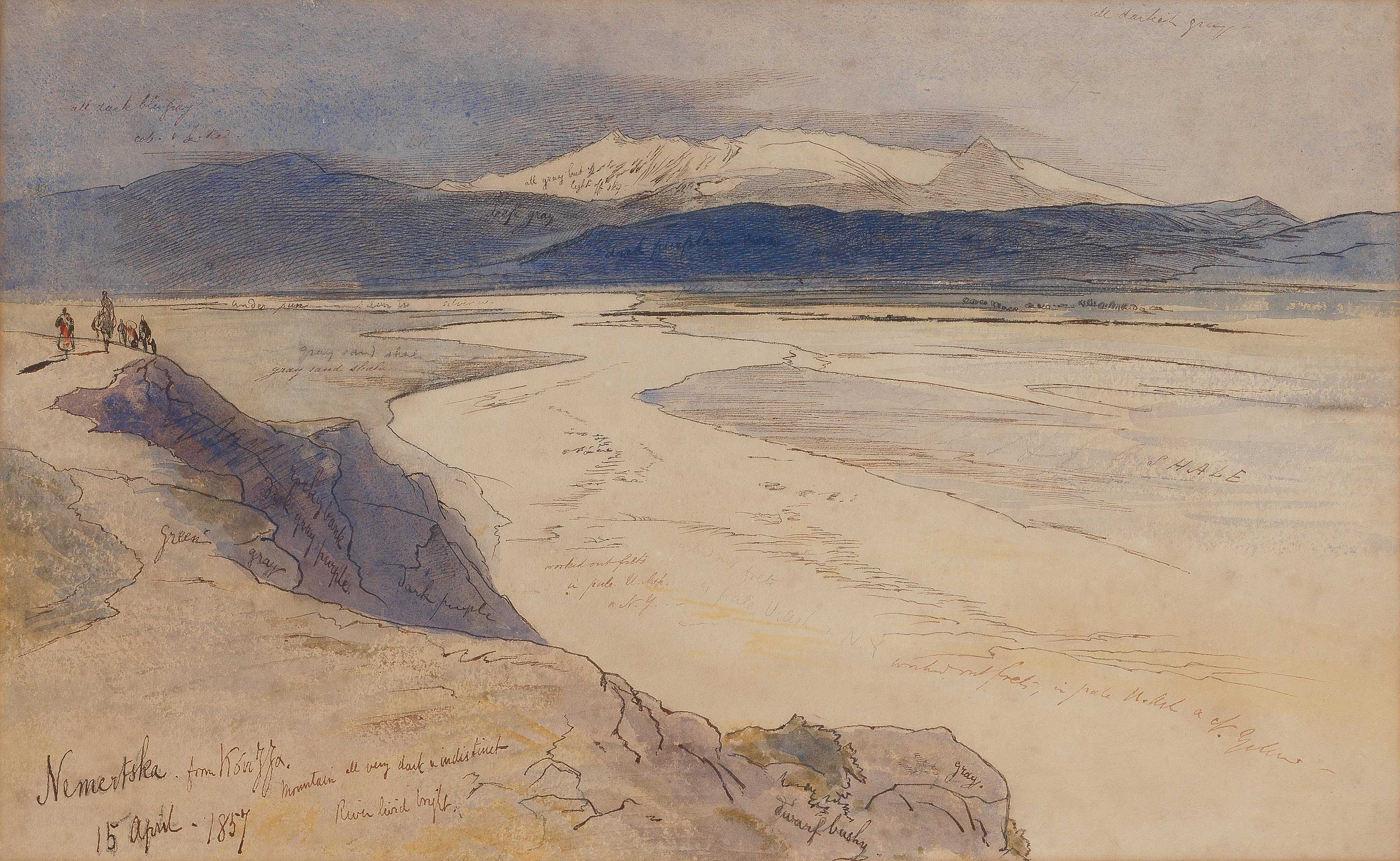 Inscribed and dated ‘Nemertska from Kouzza/15 April 1857’ (lower left), variously annotated throughout. Pen, ink and watercolour. 32.5 x 52cm (12 13/16 x 20 1/2in).