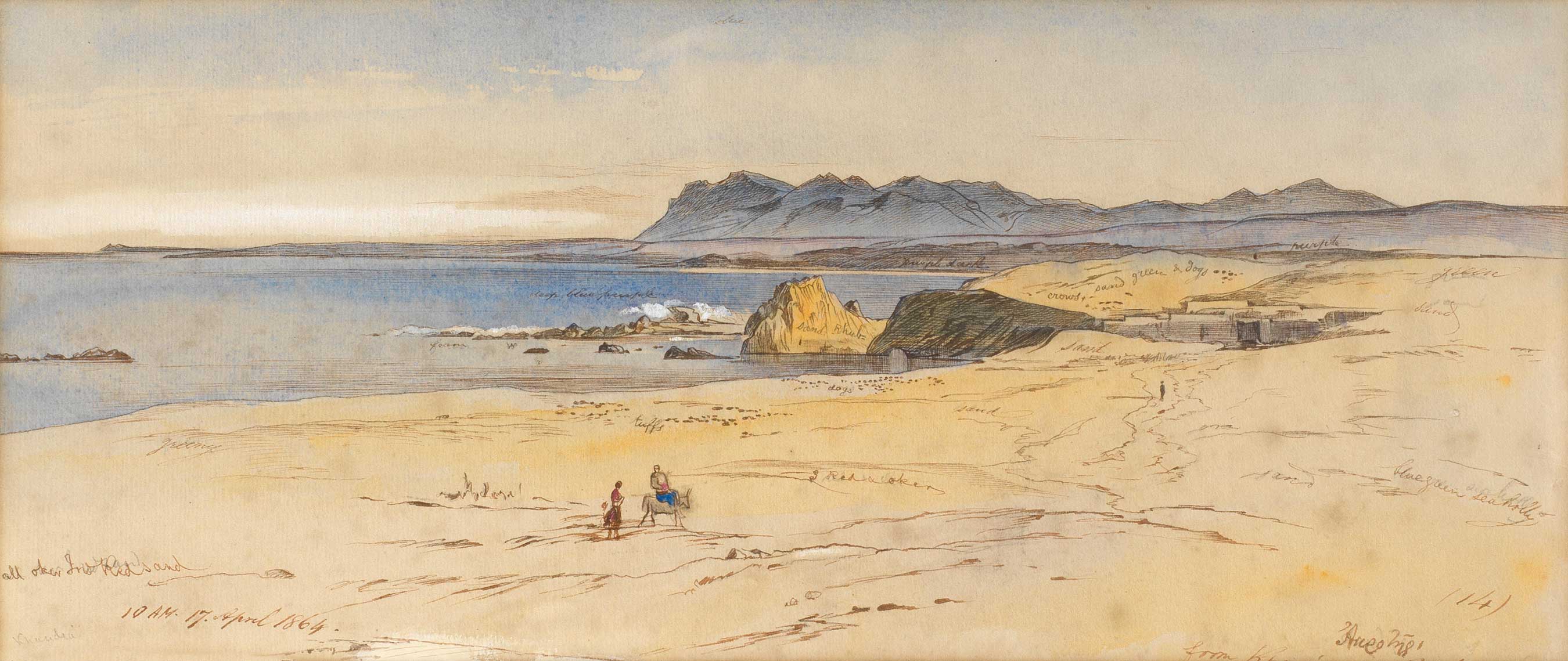 Dated ’10 AM 17 April 1864′ (lower left), numbered ‘(14)’ and inscribed ‘from Khanea’ (lower right); extensively inscribed with colour notes throughout. Pen, ink and watercolour, heightened with touches of white, 16 x 37.5cm (6 1/4 x 14 3/4in).